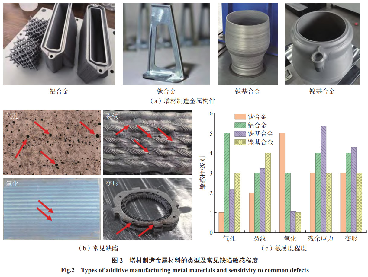 在航空航天領域,增材制造金屬材料憑借個性化成形、減重降耗的優勢,成為構件制造革新的核心支撐。圖2展示了該領域增材制造金屬材料的類型、常見缺陷及敏感程度。鋁合金以低密度和良好成形性,重點用于機身蒙皮[9]、衛星支架[10]、無人機機身框架[11]等輕質構件,未來將聚焦突破2系、7系硬鋁熱裂紋難題,開發含Sc、Zr等元素的高強鋁合金,目標適配機翼承力框架、起落架艙門等更高強度需求部件,適配大型客機輕量化升級需求[12]。鈦合金因高比強度、優異疲勞性能及高溫穩定性,成為航空航天承力與高溫構件核心材料,目前可通過PBF-LB工藝制造發動機葉片[13],使用EBAM工藝制造燃燒室[14],后續將重點攻關Ti-Al金屬間化合物的增材制造技術,突破650℃以上高溫應用瓶頸。鐵基合金以成本優勢填補中低強度構件需求空白,馬氏體時效鋼可用于制造飛機起落架輔助支撐[15]、衛星結構連接件[16]等對強度和韌性有基礎要求的部件,不銹鋼則適配航天器燃料儲箱管路[17]、航空設備殼體[18]等耐腐蝕場景,隨著成分優化與工藝改進,將進一步降低航空航天中低端構件制造成本。鎳基合金通過PBF-LB可實現航空發動機燃燒室復雜冷卻通道設計,提升散熱效率,隨著新型高溫合金的增材制造研發,將突破1200℃以上極端環境應用限制。
