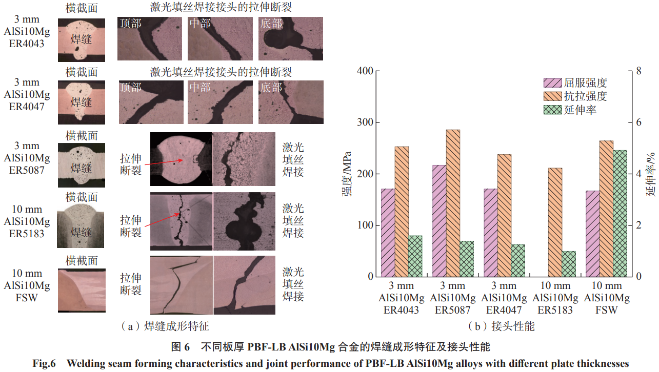 增材制造鋁合金中的孔隙缺陷被認為是影響焊縫氣孔率的關鍵因素之一。如圖5所示,Zhang等[35]發現PBF-LB成形的AlSi10Mg合金比鑄態孔隙敏感性高,而且氣孔是其成形焊縫的主要缺陷。對此,Sun等[36]進一步研究發現PBF特殊的制造過程會導致AlSi10Mg本身存在固溶的氫和顯微氫氣孔,在焊接時會大量聚集從而產生氣泡。針對該類氣孔問題,Wang等[37]采用激光金屬沉積(LMD)技術將粉末逐層熔化堆積在帶有坡口的AlSi10Mg母材之間以形成焊縫,通過減少母材熔化量來控制溶入熔池的氫含量,從而降低形成氣泡的風險。在此基礎上,張鈞翀等[38-39]采用預留對接間隙結合擺動激光焊接的方法,不僅從降低母材熔化率的角度控制氫的溶解,而且擺動光束的攪拌作用也有利于氣泡的及時溢出。針對3mm厚AlSi10Mg合金,經過優化工藝參數并選擇合適的填充焊絲,顯著降低了焊縫氣孔率,提高接頭抗拉強度至286MPa(圖6);此外,通過研究發現,與激光填絲焊相比,攪拌摩擦焊在焊接AlSi10Mg厚板方面更具優勢,接頭強度可提升25.3%,達到264MPa。