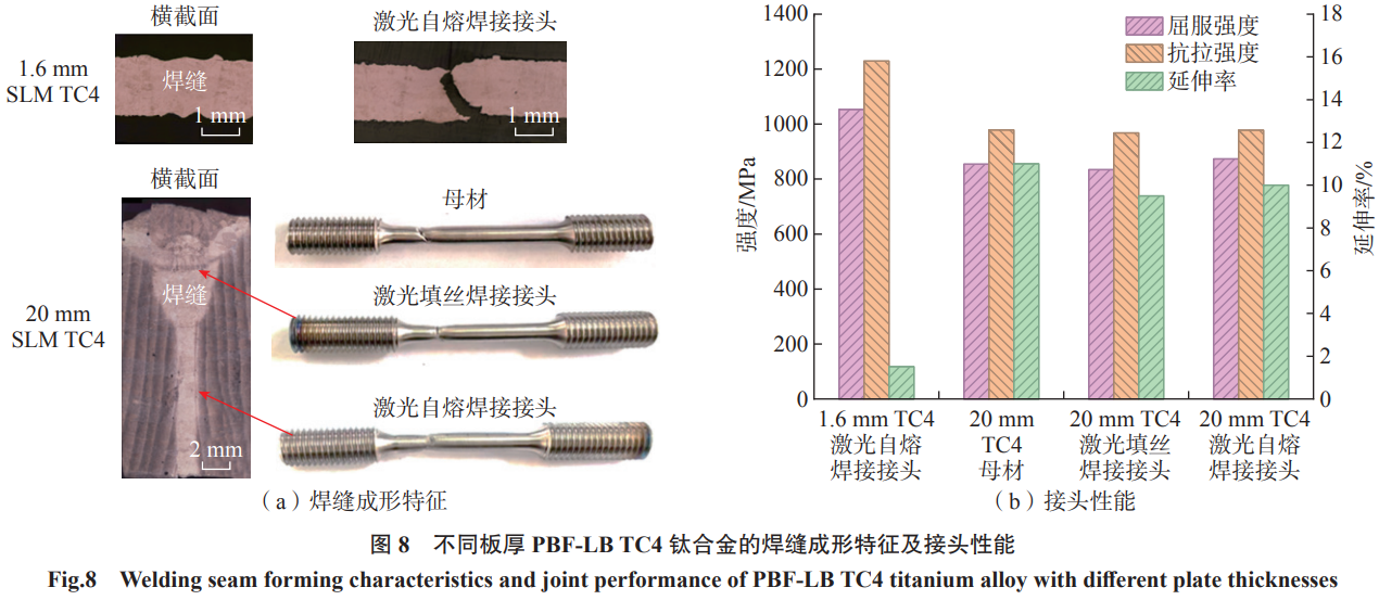 增材制造鈦合金(TC4、TC11、TA15等)具有卓越的機械和耐蝕性能,且氣孔、裂紋等焊接缺陷敏感性均低于鋁合金。由于焊接性能優良,該合金對焊接工藝適應性較高,可采用熔化焊、固相焊等多種焊接方法連接。謝輝等[45]采用電子束焊接增材制造TC4,發現焊縫區的強度高于母材區,拉伸試樣斷于母材區一側。覃佩婷[46]發現采用摩擦焊技術可以成功焊接EBM TC4鈦合金且不惡化材料的力學性能,焊接接頭拉伸斷口呈韌性斷裂特征。如圖7所示,Hu等[47]采用TIG焊接方法研究了冷金屬過渡(CMT)增材制造TC4合金的接頭組織特征,發現焊縫組織由等軸β晶粒組成且沒有擇優取向。王猛等[48]發現與鍛造TC11相比,增材制造TC11的激光焊接接頭強度更高,焊接性更好。本團隊采用激光焊接技術成功地實現了1.6mm與20mm兩種厚度PBF-LB TC4合金的無缺陷高質量焊接,焊縫形貌及接頭性能如圖8所示。對于1.6mm薄板,采用激光自熔焊即可獲得無氣孔無裂紋的焊縫,其接頭強度優異,室溫抗拉強度與屈服強度分別達到1229MPa和1053MPa,但斷后伸長率較低(1.5%)。由于該工藝方法無填充材料,導致焊縫的有效承載面積降低,促使拉伸試樣沿焊縫區域發生斷裂。對于20mm厚板,采用“激光自熔焊+激光填絲焊”的焊接工藝,不僅有效地保障了接頭成形質量,而且通過減少焊接道次顯著提高了焊接效率。拉伸測試結果表明,自熔焊和填絲焊區域的接頭強度均高于母材(979MPa),試樣沿母材區斷裂,有力印證了該工藝下焊接接頭的強度優勢。