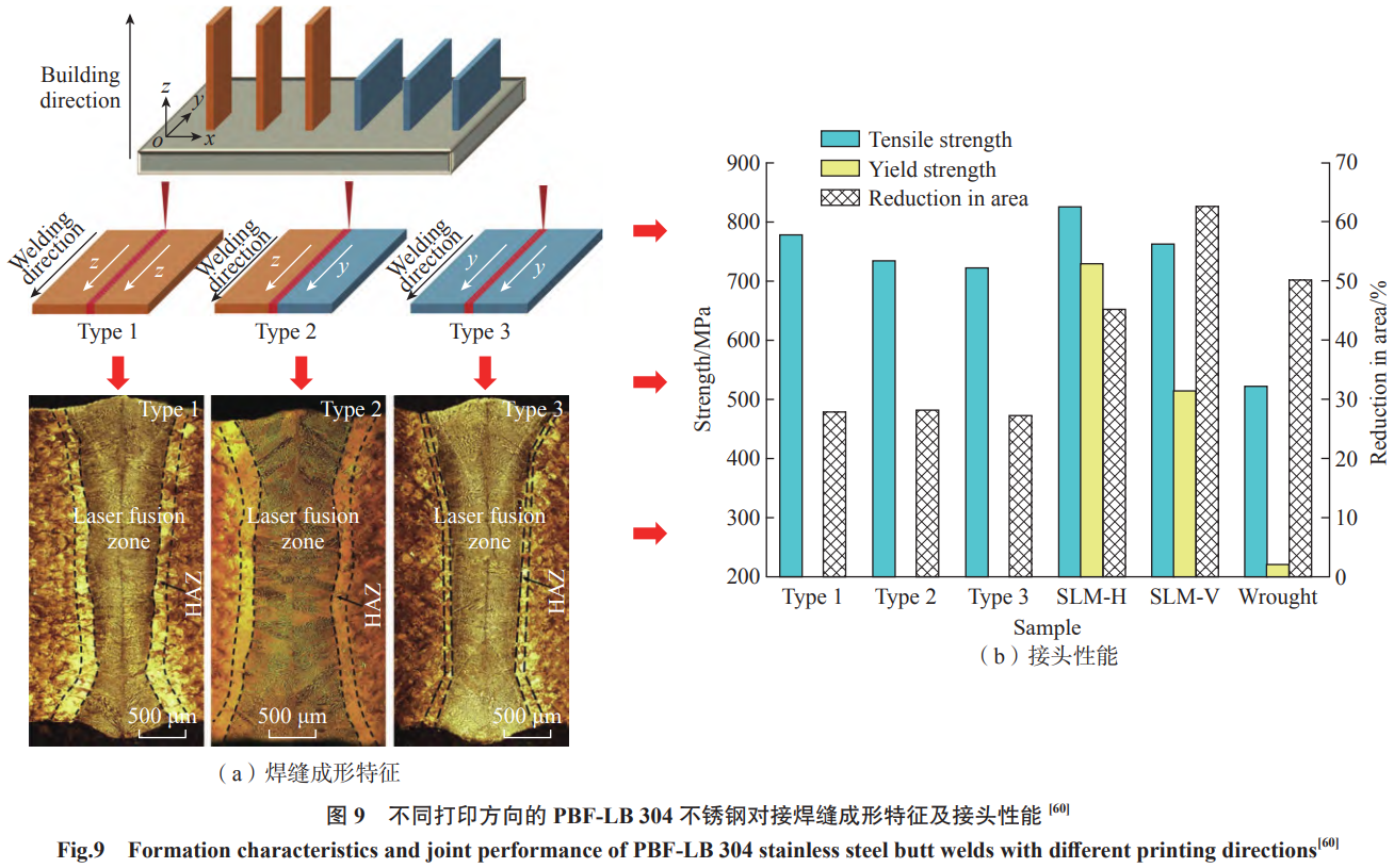 近年來,增材制造鐵基合金的焊接研究逐漸成為材料與制造領域的熱點。目前,研究對象主要集中在合金鋼和不銹鋼等常用工程鐵基合金,原因在于其廣泛的工業應用背景及復雜熱歷史導致的各向異性和微觀缺陷問題。增材制造制備的鐵基材料通常存在氣孔、未熔合區、粗大晶粒及成分非均勻等缺陷,這些缺陷會顯著影響焊接接頭的力學性能和服役可靠性,因此選擇合適的焊接方法對于修復母材缺陷、改善接頭性能具有重要意義。針對增材制造鐵基合金的焊接未熔合等缺陷的研究,劉鑫泉等[56]發現,對于小尺寸粉末(小于25μm)增材制造得到的低活化鐵素體/馬氏體鋼板(RAFM),激光焊接能夠有效修復增材制造過程中遺留的道間未熔合缺陷,顯示出激光焊在高精度修復和局部熱控制上的優勢。Mohyla等[57]研究了PBF-LB制備的AISI316L不銹鋼,指出母材中存在的氣孔是導致TIG焊接接頭力學性能下降的主要原因,尤其是在熱影響區附近,試樣在屈服前發生局部斷裂,這表明母材缺陷控制對焊接性能至關重要。Mokhtari等[58]通過激光焊接獲得了PBF-LB AISI316L和冷軋 AISI316L的無缺陷焊縫,但兩者焊縫組織存在明顯差異;PBF-LB AISI316L熔合區存在外延生長現象,而冷軋AISI316L的熔合區則由奧氏體孿晶及等軸晶粒的優先取向生長所形成,這表明母材制備方式對焊縫晶粒取向和微觀結構具有顯著影響。Casalino等[59]采用激光-電弧復合焊方法焊接PBF-LB AISI316L,發現由于PBF-LB過程中形成的細小晶粒及局部元素沉淀,熔合區靠近PBF-LB一側晶粒取向呈隨機分布,表明復合焊接方法在調控晶粒結構上具有潛力。如圖9所示,Yang等[60]研究了PBF-LB304不銹鋼的各向異性對焊接性能的影響,結果表明,沿著PBF-LB母材沉積方向焊接時,焊縫形成的細小枝晶結構能夠改善接頭的拉伸性能。