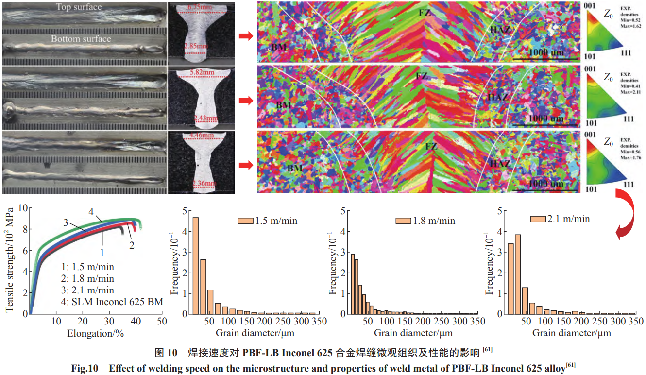增材制造鎳基合金的焊接研究熱點也主要集中在焊接工藝適用性、焊縫組織特征及演化規律、氣孔及裂紋缺陷等方面,涉及的焊接方法主要以激光焊接為主。Hong等[61]研究了激光焊接速度對PBF-LB Inconel 625合金接頭微觀組織的影響,結果發現,隨著焊接速度的增加,焊縫區晶粒尺寸和高角度晶界(HAGB)的比例減小,而拉伸強度和延伸率得到了提高,如圖10所示。Hu等[62]發現 PBF-LB Inconel 625激光焊接接頭在815℃的拉伸強度高于母材,而由柱狀晶組成的焊接區的抗拉斷裂性能竟然優于原始的具有等軸晶粒的PBF-LB合金,因而認為激光焊接是連接該材料的高效方法。Zhang等[63]發現PBF-LB Inconel 625激光焊接試樣的疲勞和蠕變疲勞性能均優于未焊接試樣,焊縫區晶界碳化物的強化效應及無明顯焊接缺陷促使了焊縫的性能提升,再次印證了激光束焊接在連接PBF-LB Inconel 625方面具有很大的優勢。