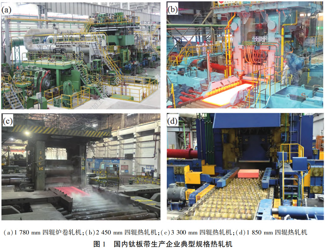 圖1為國內鈦板帶典型生產企業熱軋生產線現場圖。圖1(a)為攀鋼集團沈陽有色金屬加工廠1780 mm四輥可逆鈦板帶爐卷熱軋機組,2013-2014年由意大利達涅利集團公司和國內鞍鋼重型機械有限公司聯合設計制造。圖1(b)為新疆湘晟新材料科技有限公司2450mm四輥可逆鈦板材熱軋機組,2017-2018年由二重(德陽)重型裝備有限公司設計制造。圖1(c)為寶鈦集團公司3300mm四輥可逆鈦板材熱軋機組,20世紀七八十年代由法國SACK公司設計制造,寶鈦集團于1989年從原西德引進。圖1(d)為寶鈦股份1850mm四輥可逆宇航級鈦板材熱軋機組,2020-2021年由中國一重設計制造。