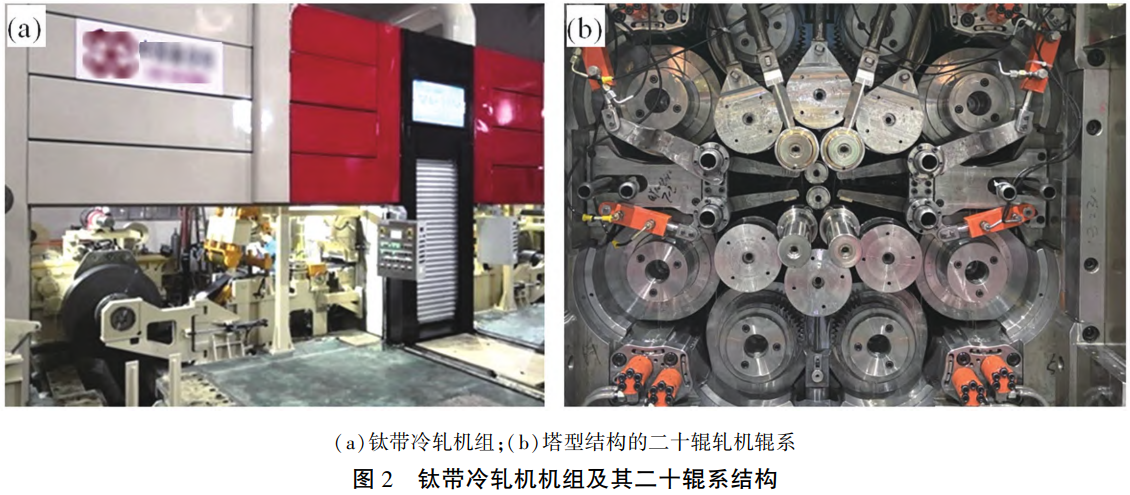 鈦的屈服強度高,軋制反彈性較強,且密排六方結構導致各向異性顯著,使用普通兩輥或四輥軋機較難實現鈦薄板帶的軋制,為了滿足要求,目前行業生產時主要采用六輥、二十輥等多輥軋機進行軋制。其中二十輥軋機是生產高精度鈦薄帶和箔材的最佳機型[9]。冷軋寬而薄的鈦帶材時,隨著變形程度的增加,變形抗力加大,要求軋輥的彈性壓扁要小,而當軋輥的壓扁量等于或接近產品的厚度時,其再軋制的變形量將趨于零。軋輥的壓扁量與軋輥的直徑和軋制力呈正比。因此,要軋制厚度很小的帶材,唯一的途徑就是選擇小直徑的工作輥。但是高精度帶材的厚度精度和橫向厚差要求高,軋制過程中需要承受較大的變形抗力,這與小直徑軋輥相矛盾。塔形輥系的多輥軋機很好的解決了使用小直徑工作輥的技術問題,軋制力相對較小,可減少軋制磨擦發熱和軋輥磨損以及軋制力矩。相比傳統四輥軋機,以二十輥輥系為代表的多輥冷軋機具有橫向剛度高、控制精度高、產品板型質量好、道次加工率大、節能等優點,但其結構也較為復雜。圖2(a)為中國重型機械研究院股份公司設計制造的鈦帶冷軋機組,圖2(b)為塔型結構的鈦帶二十輥軋機輥系。