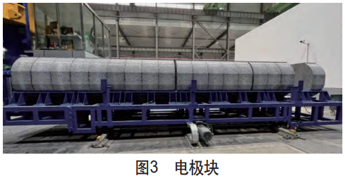 試驗用原材料為國內大廠生產的0級標準顆粒海綿鈦。計劃各投料 12 t,試制兩個純鈦鑄錠。海綿鈦經先進的全自動混布料系統,可滿足不同組分原料的準確稱重及充分混合,之后經萬噸級油壓機壓制成電極塊,電極塊密度>3.3g/cm³,確保熔煉無掉塊。海綿鈦、萬噸級油壓機和電極塊分別如圖1~圖3所示。