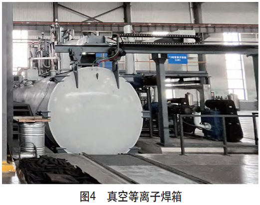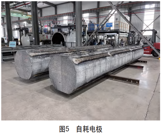電極塊焊接采用的真空焊箱,可實現單重15t一次性焊接,防止了爐外焊接過程中接觸大氣帶來的氧化、氮化污染。單根電極可完成一個15t成品鑄錠的生產任務,防止了電極對焊不良產生的掉塊、斷裂等影響產品質量的隱患發生,保證了鑄錠產品的冶金品質。經真空等離子焊箱焊接得到自耗電極,真空等離子焊箱和自耗電極分別如圖4、圖5所示。