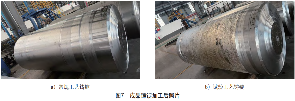 將其中一根鑄錠按照常規處理工藝整錠扒皮后取樣,命名為常規工藝鑄錠;另一根鑄錠僅在頭、底部扒皮并取樣,命名為試驗工藝鑄錠。試樣按照GB/T 4698標準進行成分檢測。處理后的成品鑄錠如圖7所示,鑄錠成分見表2。
