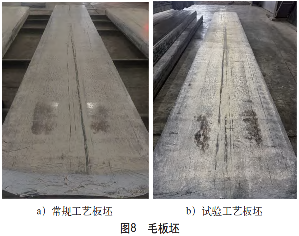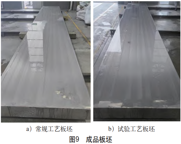 常規工藝和試驗工藝鑄錠在箱式電阻爐中按照(1000~1050)℃x(300~360)min的加熱制度加熱,再分別經63MN(1tf≈10kN)快鍛機按一大火次壓扁鍛造成毛板坯,變形量為70%~75%,毛板坯經銑磨后得到尺寸為(200~220)mmx(1250~1260)mmxL的成品板坯;毛板坯如圖8所示,成品板坯如圖9所示。