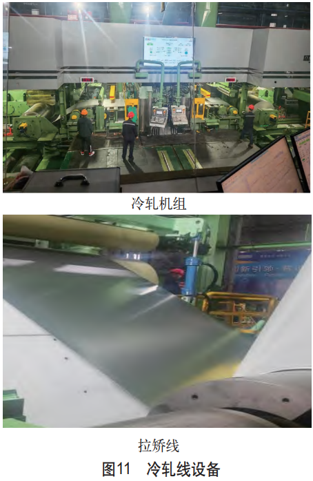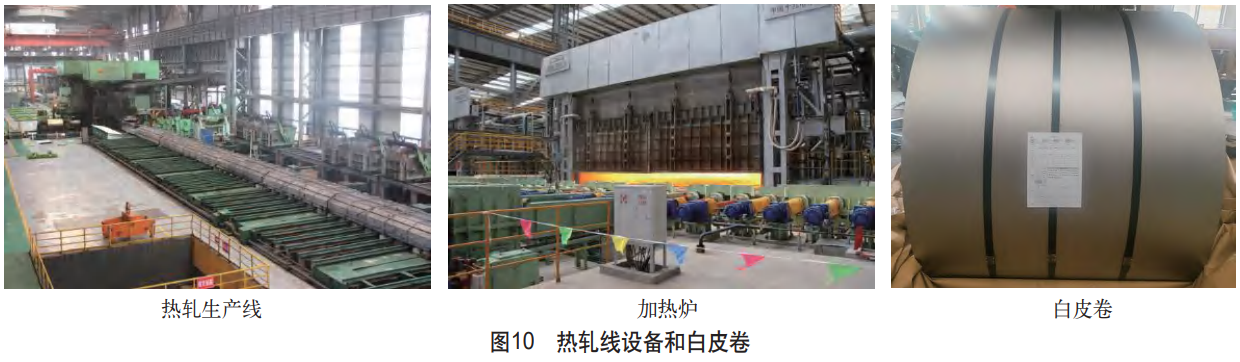 成品板坯經步進式加熱爐加熱至(1000~1050)℃x(180~300)min。之后經1700mm熱軋生產線熱軋成卷、酸洗、切邊,得到厚度約4mm、寬度為1250mm的白皮卷。熱軋線設備及白皮卷如圖10所示。