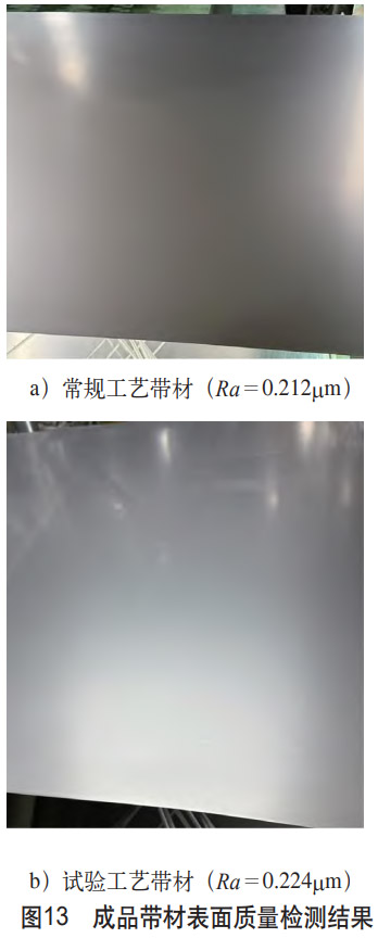 對拉矯后的成品帶材進行表面質量檢測。本次試制的帶材表面質量高,無壓坑、劃傷等表面缺陷,表面質量Ra值均小于0.25μm,達到超精細表面水平。表面質量檢測結果如圖13所示。