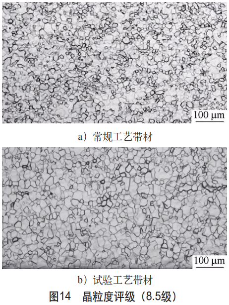 對常規工藝和試驗工藝的成品帶材進行高倍組織的晶粒度評級,客戶要求晶粒度≥5級,評級結果均為8.5級,滿足要求,如圖14所示。
