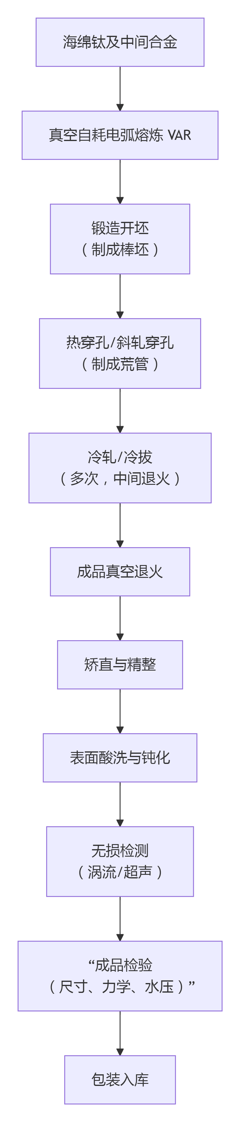 以廣泛應(yīng)用的無縫TA2換熱管為例,其典型加工流程如下: